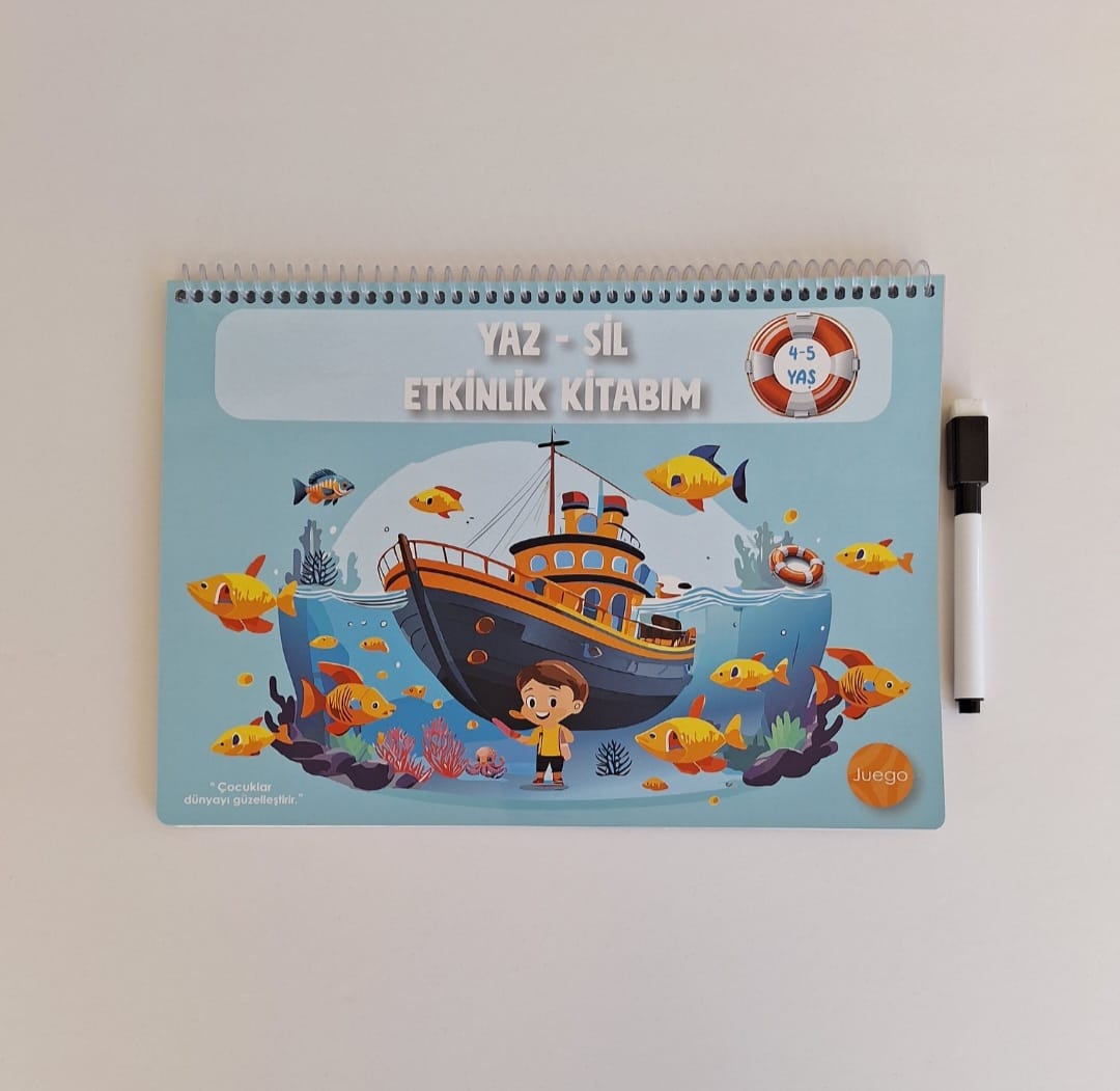 Yaz – Sil Etkinlik Kitabım, 4-5 yaş arası çocukların kalem tutma, çizgi takip etme ve el-göz koordinasyonu gibi temel becerilerini geliştirmek için tasarlanmış, eğlenceli ve tekrar tekrar kullanılabilir bir etkinlik kitabıdır. ✍️🧠